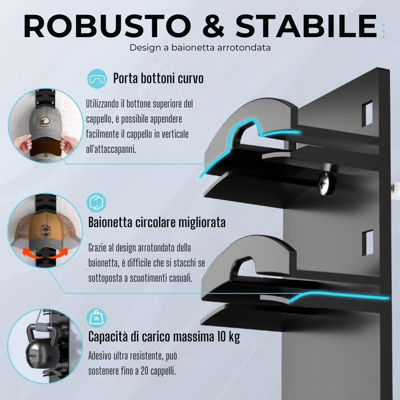 Un cappello, uno livello: l'organizzatore per cappelli è progettato con un cappello e un livello per un facile accesso. A differenza dei ganci per cappelli sul mercato, è difficile rimuovere lo strato inferiore dei cappelli. Non è necessario impilare gli strati, anche lo strato inferiore dei cappelli può essere facilmente rimosso sollevando delicatamente la tesa.